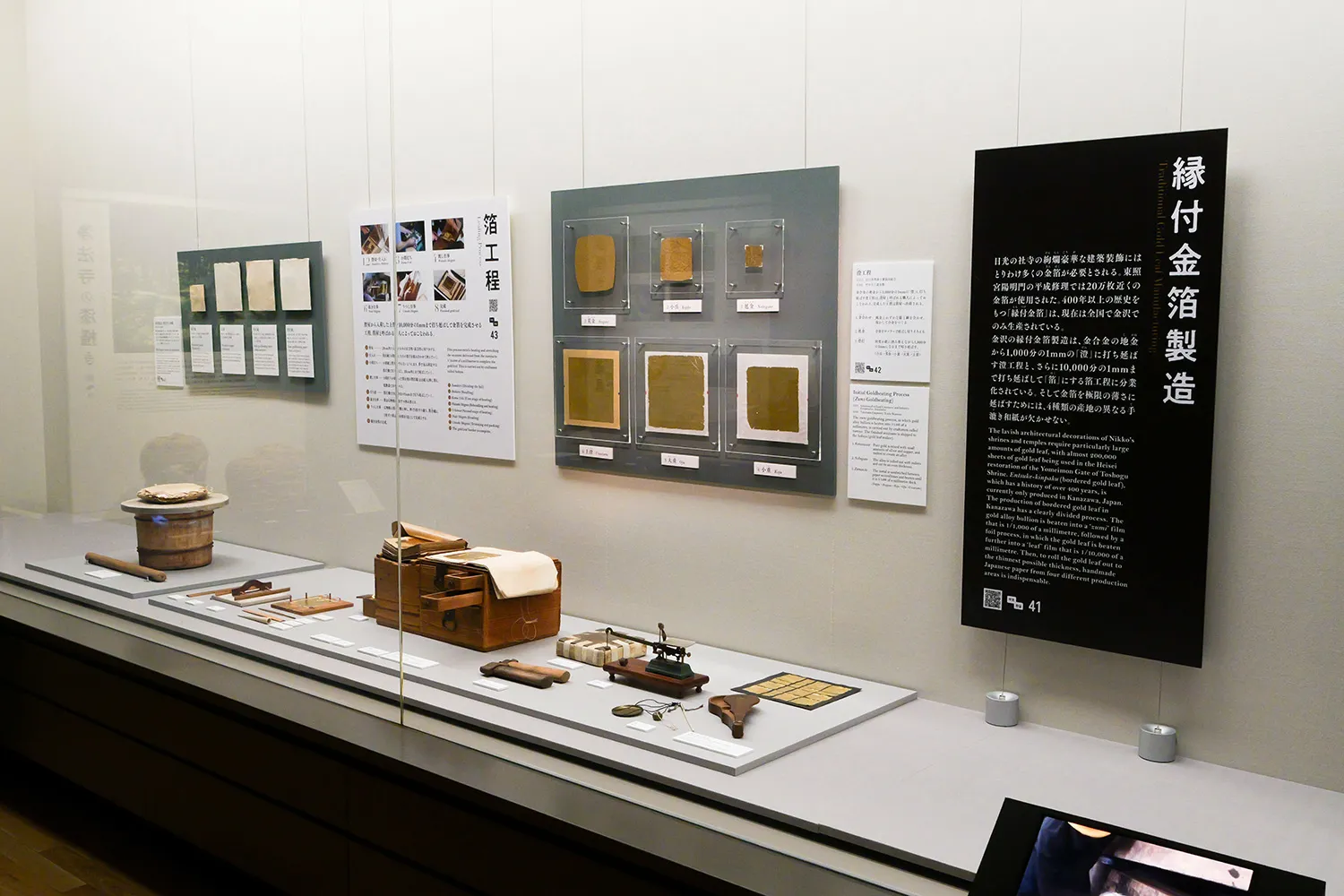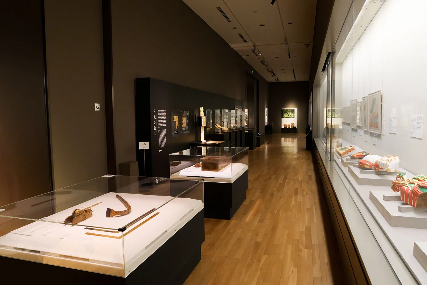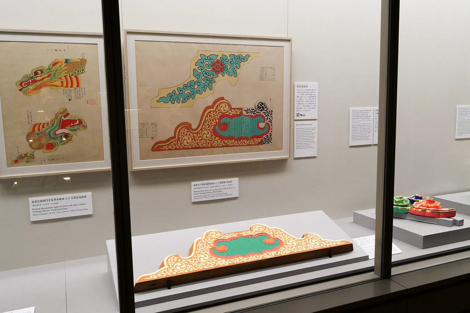 世界遺産「日光の社寺」の魅力は、圧倒的に豪華絢爛な建築装飾。本展では建築装飾を支える伝統技術のうち「彩色」と「金工」に着目し、日光東照宮にまつわる資料や職人の道具などを通じて、きらびやかな建築装飾の世界とそれを支える匠の技について紹介しています。