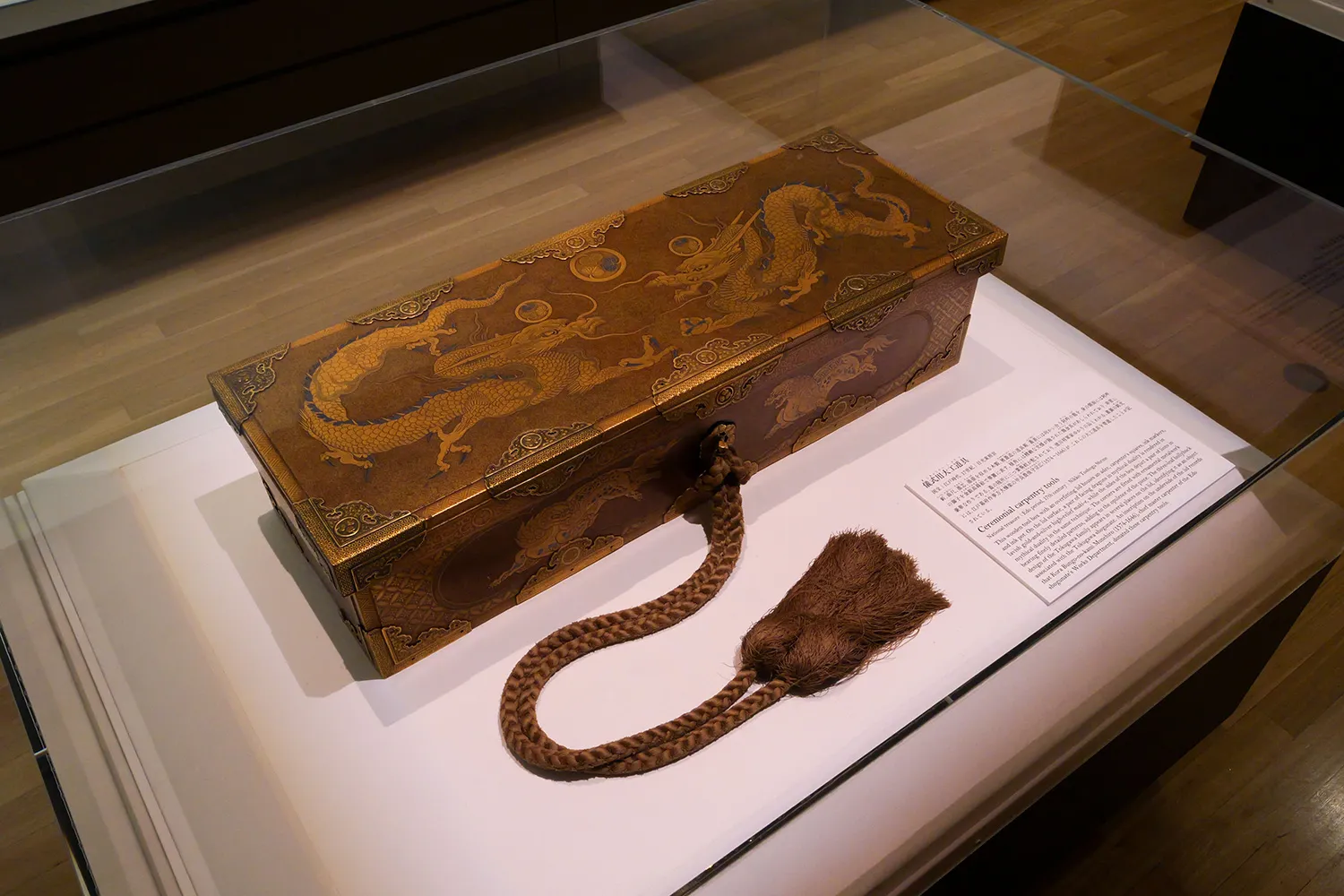 道具箱は金銀高蒔絵(きんぎんたかまきえ)による華麗な装飾が施されています。蓋表に阿吽(あうん)の龍、身には阿吽の獅子、随所に三つ葉葵紋が施され、徳川将軍家ゆかりの品であることが示されています。