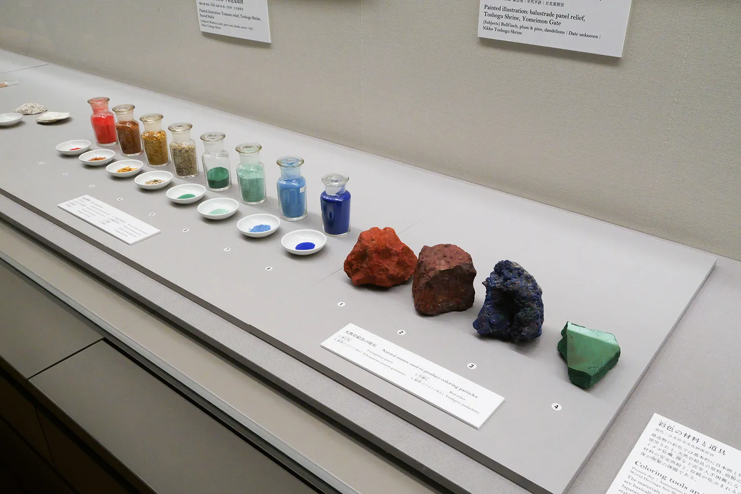彩色の原材料と道具の展示。天然原材料は近年入手困難になりつつあり、職人の手道具は作り手の確保が難しくなっているそうです。いずれも喫緊の対策が求められています。(日光社寺文化財保存会蔵)