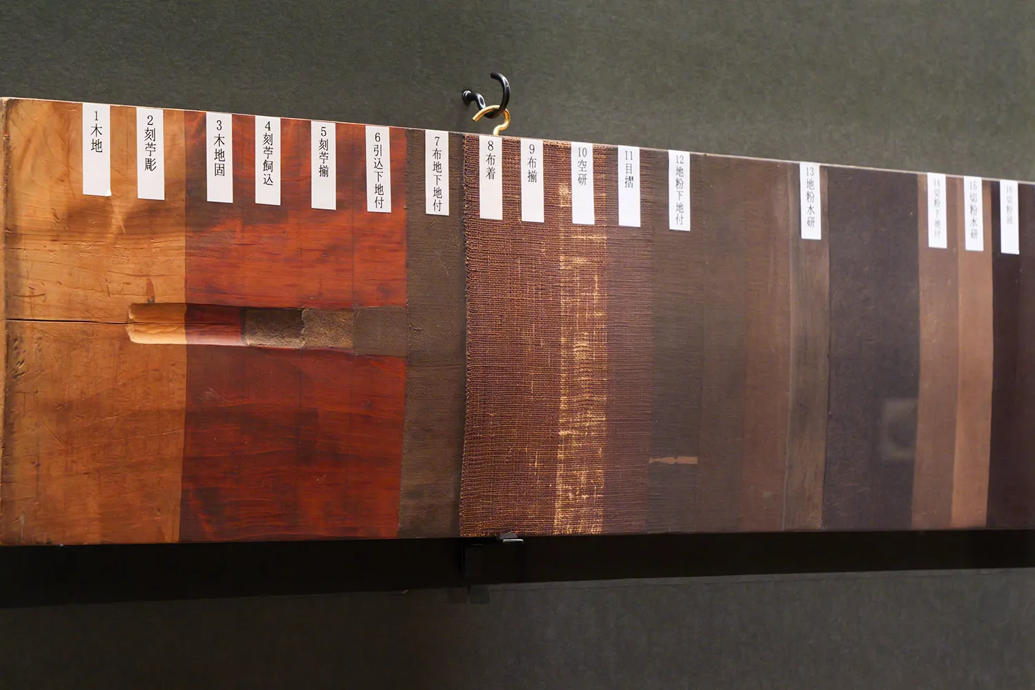 漆塗の手板(日光社寺文化財保存会蔵)。日光の厳しい気候条件に耐えるため、30~40もの地道な工程が重ねられています。