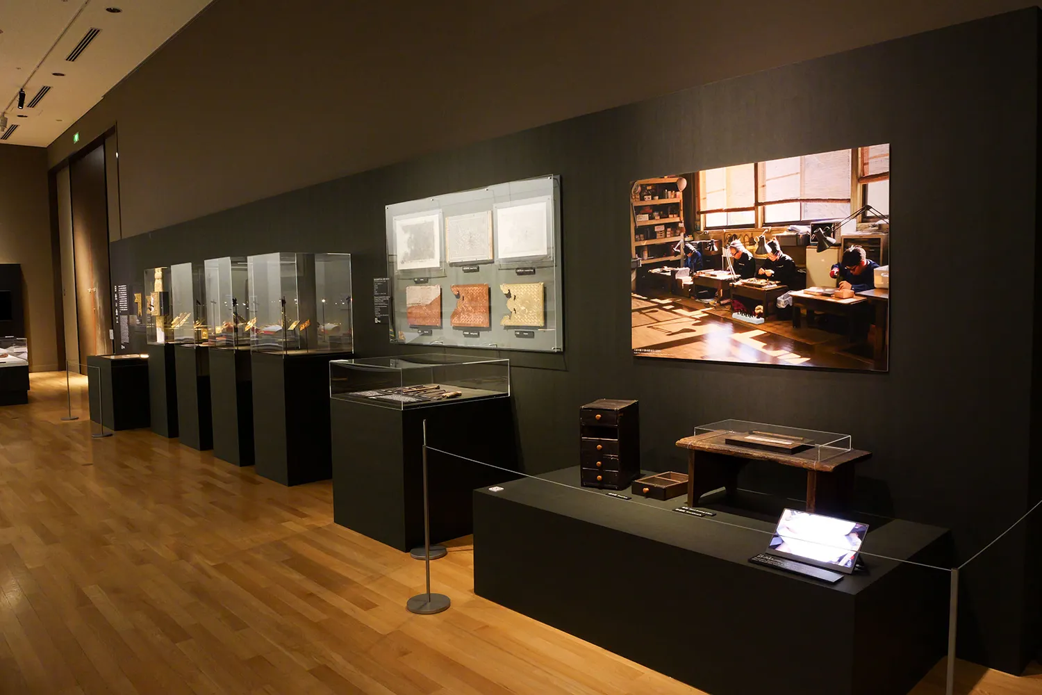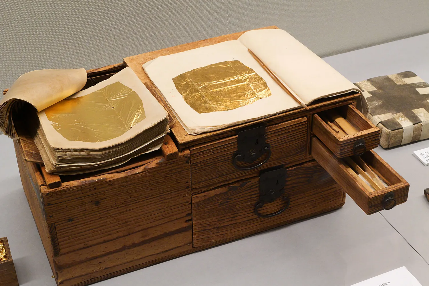 日光の絢爛豪華な建築装飾には大量の金箔が必要です。縁付金箔(えんつけきんぱく)製造コーナーでは、金の合金から薄さ10,000分の1mmの金箔に叩き延ばす技術を紹介しています。薄い金箔をつくるためには手漉き和紙が欠かせませんが、紙仕込みの道具を東京会場限定で展示しています。(石川県箔商工業協同組合蔵、松村製箔所蔵)