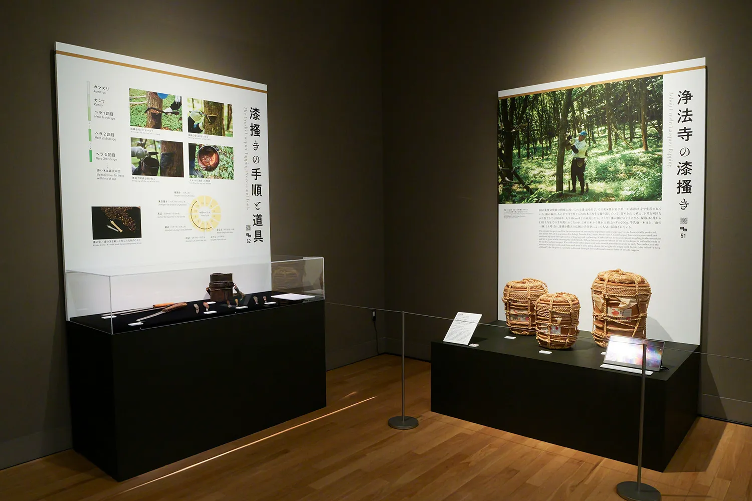 浄法寺の漆搔き(うるしかき)コーナーでは、漆採取の道具とあわせて採取の手順を解説しています。(日本うるし搔き技術保存会蔵、浄法寺歴史民俗資料館蔵)