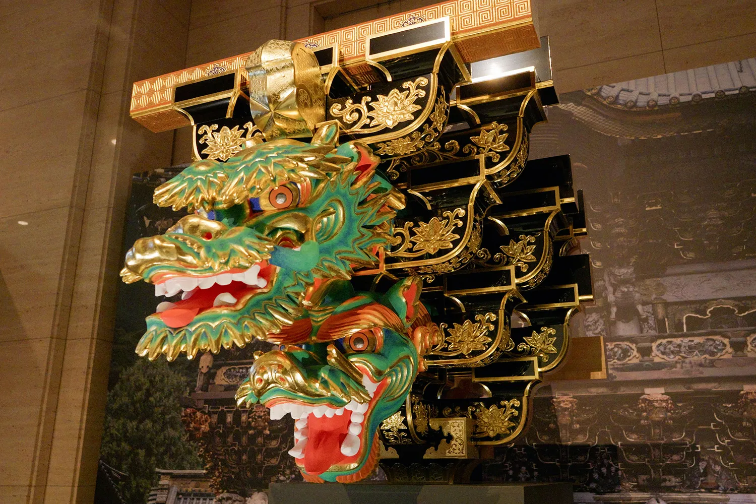 大迫力の東照宮陽明門組物模型(とうしょうぐうようめいもんくみものもけい)は、東京会場の規模にあわせて神戸会場よりやや高めの位置に設置しました。建築装飾技術の粋が詰まった組物です。